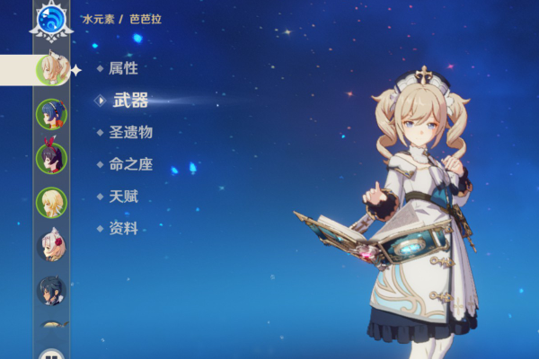 4、再再后是芭芭拉水套圣遗物增加伤害和水元素伤,武器增加伤害。