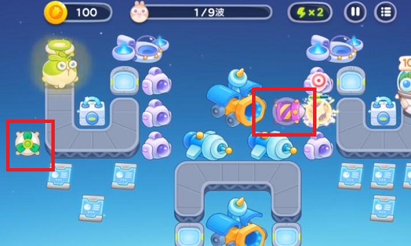 4、第7波清理中间下面的道具后放月亮塔,最后一波火力集中在右边。