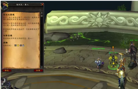 耐心听完矮人圣骑士的对话(时间有几分钟 ,不要放弃),他啰调三嗦完头上就会显示任务完成了。再与他对话接到前往北裂境任务,需要凛风峡湾。这个任务有个非必要的前提任务,穿过达拉尔的传送门,非法师建议走传送门最近。
