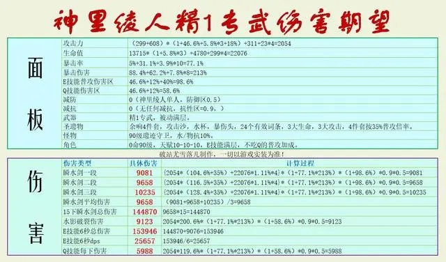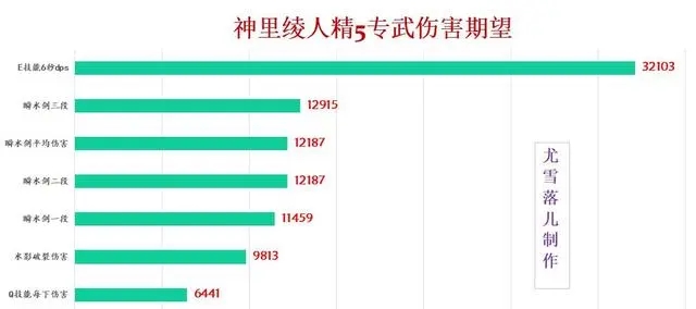 1、精5专武伤害期望如图所示,E技能dps32103,瞬水剑三段12915,瞬水剑二段12187,瞬水剑一段11459,Q技能每下伤害6441。