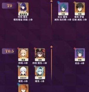 1、T0、雷电将军、行秋、钟离。T0.5、宵宫、胡桃、神圣绫华、优菈、达达利亚、香菱