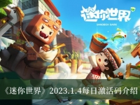 迷你世界2023.1.4每日激活码是什么?迷你世界这是一个超级火爆的益智类型的手游。游戏的玩法是比较自由的,在这里大家可以通过自己的想象去构造一个全新的世界!整个游戏中拥有着海量的道具是可以无限制的使用的,玩家在游戏中还可以通过不断的破坏去获得自己需要的一切的资源!整个游戏的操作也是比较简单的